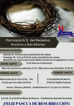 Adjuntamos los horarios en la galería de imágenes, también podrán consultarlos en la página en Facebook de Iglesia San Alfonso - Santuario del Perpetuo Socorro